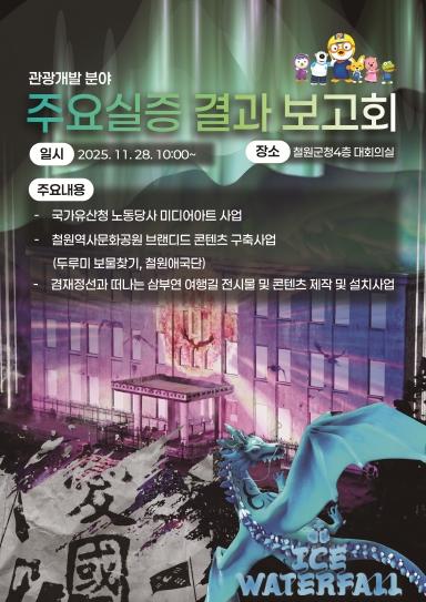 [한국제일신문, 김성옥기자] 철원군은 지역 관광 경쟁력 강화를 위해 추진한 다양한 실증 사업의 성과를 공유하는 자리를 마련한다. 2025.11.28일 오전 10시 철원군청 4층 대회의실에서 관광개발 분야 주요실증 결과보고회가 개최된다.