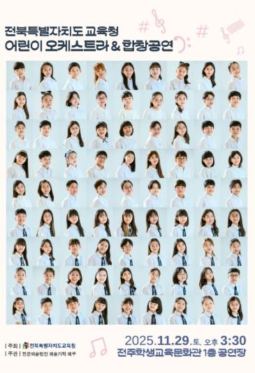 [한국제일신문, 윤진성기자] 전북특별자치도교육청은 오는 29일 전주학생교육문화회관 1층 공연장에서 ‘2025 전북특별자치도교육청 어린이 오케스트라 & 합창공연’을 개최한다.