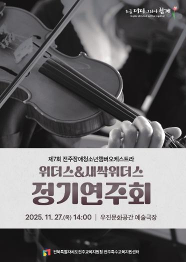 [한국제일신문, 김성관기자] 전북특별자치도전주교육지원청은 장애청소년의 꿈과 재능을 응원하는 제7회 장애청소년 챔버오케스트라 위더스·새싹위더스 정기연주회를 27일 우진문화공간 예술극장에서 개최했다.