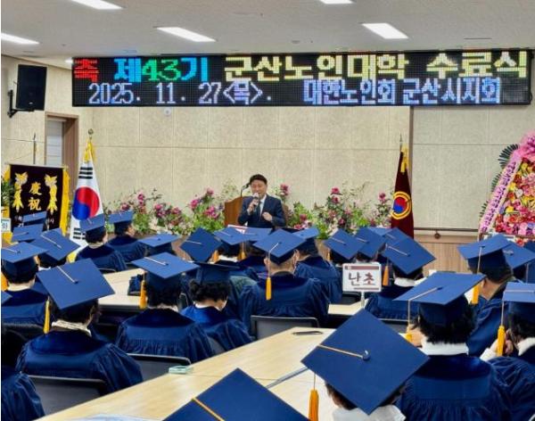 [한국제일신문, 김성관기자] 대한노인회 군산시지회가 주최한 ‘2025년 제43회 노인대학 수료식’이 27일 군산시 노인회관 3층 대강당에서 성황리에 개최됐다.