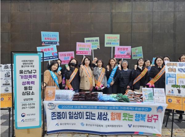 [한국제일신문, 김성옥기자] 울산 남구는 ‘2025년 여성폭력 추방주간’을 맞아 27일 삼산 디자인거리 일대에서 울산성매매피해상담소와 울산남구가정폭력·성폭력통합상담소가 함께 ‘2025년 여성폭력 추방주간 캠페인’을 실시했다.