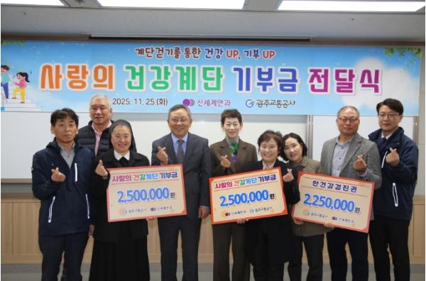 [한국제일신문, 윤진성기자] 광주교통공사는 최근 서구 마륵동 본사에서 신세계안과와 함께 ‘사랑의 건강계단’ 기부금 전달식을 개최하고, 후원금 5백만원과 225만원 상당의 안(眼)건강검진권을 ▲즐거운노인주간보호센터 ▲광주이주여성지원센터 ▲노틀담형제의집에 전달했다.