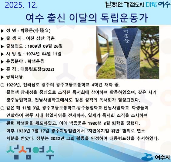 [한국제일신문, 윤진성기자] 여수시는 2025년 12월의 독립운동가로 전라남도 여천 삼산 덕촌 출신의 ‘박종문(朴鍾文)’ 선생을 선정했다.