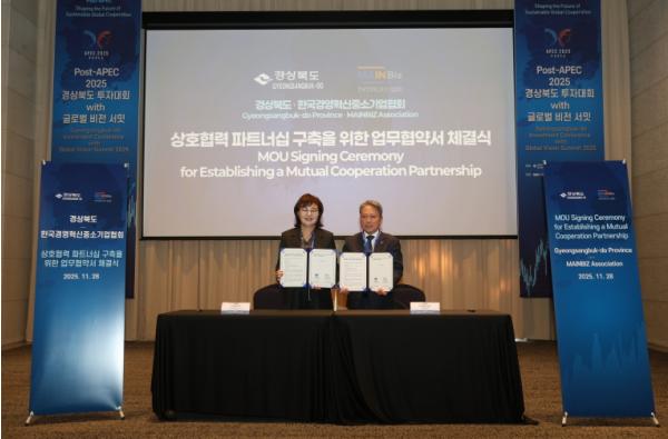 [한국제일신문, 김성옥기자] 경상북도는 28일 경주 황룡원에서 한국경영혁신중소기업협회와 해외기업과 외국인 투자유치 협력을 대폭 강화하기 위한 상호협력 파트너십 업무협약(MOU)을 체결했다.