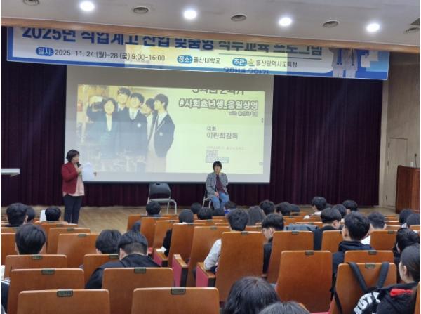 27일에는 울산대학교 시청각교육관 다매체 강당에서 현장실습과 취업이 확정된 3학년 학생 100명을 대상으로 직업계고 현장실습을 소재로 한 영화 ‘3학년 2학기’를 관람했다.