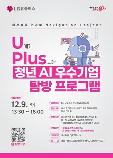[한국제일신문, 김성옥기자] 서울 용산구는 인공지능(AI)·정보기술(IT) 분야에 관심 있는 청년 취업준비생을 대상으로 LG 유플러스와 함께하는 '미래직업 커리어 Navigation Project - U에게 Plus가 되는 청년 인공지능 우수기업 탐방 프로그램'을 운영한다고 밝혔다.