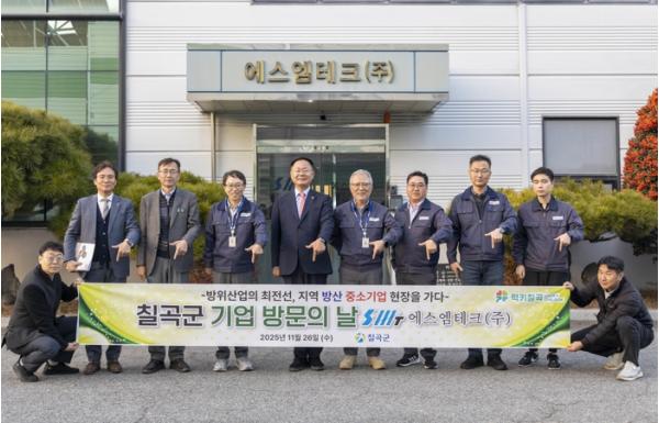 [한국제일신문, 김성옥기자] 칠곡군은 11월 26일, 올해 마지막 ‘기업방문의 날’을 맞아 글로벌 수출 호황으로 빠르게 성장하고 있는 지역 내 방산 중소기업 ▲(주)엠케이디에스 ▲(주)환화 ▲(주)에스엠테크를 방문했다.