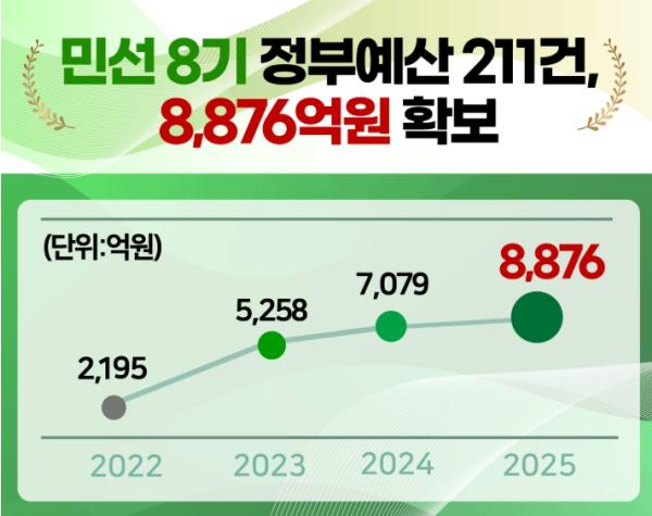 괴산군이 민선 8기 들어 확보한 정부예산은 지난 18일 기준으로 무려 211건, 8,876억 원에 달하는 어마어마한 금액이다.