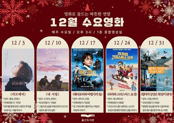 [한국제일신문, 김성옥기자] 울산도서관이 12월 한 달 동안 ‘영화로 물드는 따뜻한 연말’을 주제로 매주 수요일 오후 3시 도서관 1층 종합영상실에서 수요영화를 상영한다.