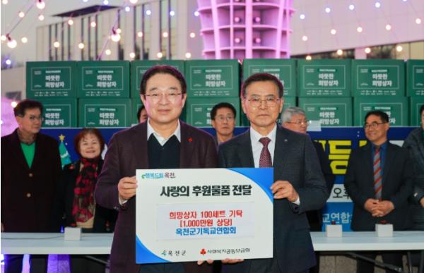[한국제일신문, 김성옥기자] 옥천군과 옥천군기독교연합회가 지난 30일 일요일 향수공원 홍보탑 일원에서 2025년 성탄절 트리 점등식과 함께 희망상자 기탁식을 개최했다.
