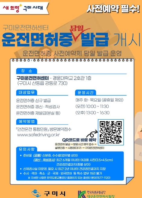 한편 구미운전면허센터는 학과시험, 교통안전교육, 운전면허 당일 발급 업무를 운영하며(단, 수시·격하·축소·군·국제·외국면허 등 특수업무 제외), 운영 시간은 매주 화·목요일 오전 10:00~11:30, 오후 13:00~16:30이다.