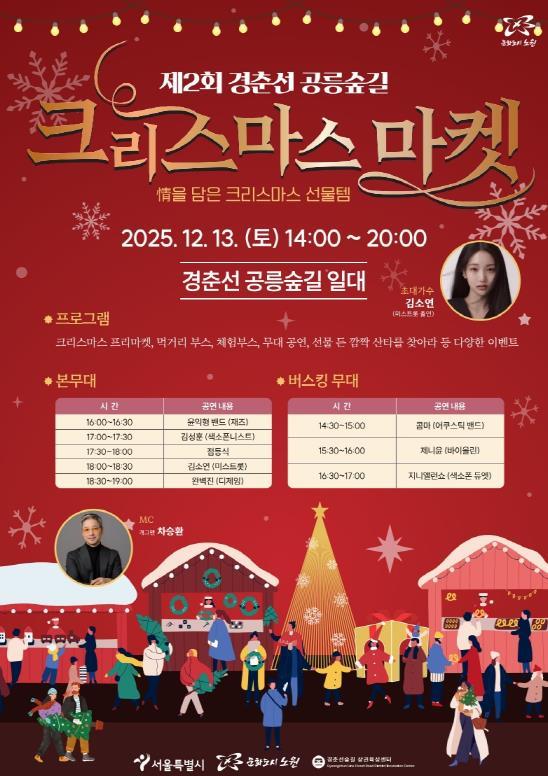 행사는 오후 2시부터 8시까지로 트리 점등식부터 먹거리 부스, 프리마켓, 문화공연, 체험 프로그램 등이 이어진다. 이와 함께 오는 6일 조성될 ‘경춘선 공릉숲길 빛의 거리’가 더해져 방문객들에게 따뜻한 연말 분위기와 크리스마스의 매력을 선사할 예정이다.