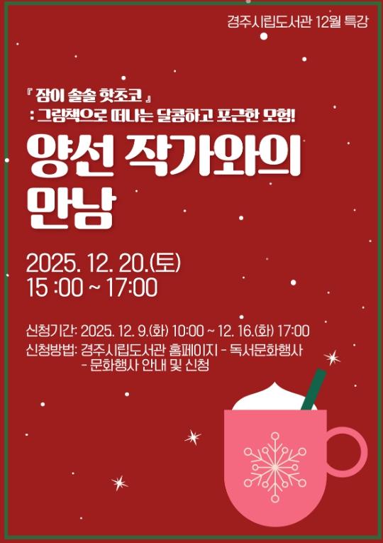 참여 신청은 12월 9일 10시부터 16일 17시까지 경주시립도서관 홈페이지(독서문화행사→문화행사 신청)에서 선착순으로 가능하다.