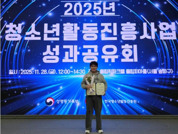 [한국제일신문, 윤진성기자] 순천시는 지난 28일 서울특별시 올림픽파크텔에서 열린 2025년 청소년활동진흥사업 통합 성과공유회에서 순천시청소년문화의집 방과후아카데미를 수료한 왕윤성 학생이 『2025년 청소년방과후아카데미 활동수기 공모전』 일반부문에서 성평등가족부 장관상(대상)을 수상하는 쾌거를 이뤘다고 밝혔다.
