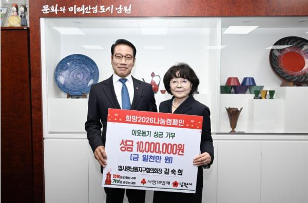 [한국제일신문, 이미란기자] 남원시는 '희망2026 나눔 캠페인'의 본격적인 시작과 함께, 매년 꾸준한 나눔을 실천해 온 김숙희 회장(법무부 법사랑위원 남원지구협의회)이 올해도 변함없는 기부 참여로 남원시 1호 기부자가 됐다고 밝혔다.