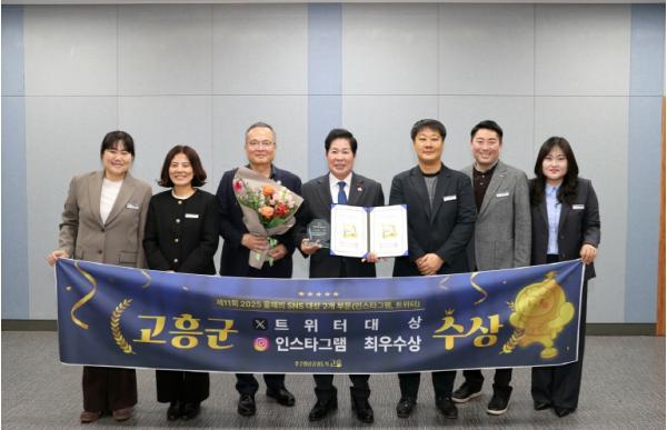 고흥군(군수 공영민)은 지난 11월 26일 서울 한국프레스센터 국제회의장에서 열린 ‘제11회 2025 올해의 SNS 대상’ 시상식에서 트위터 부문 대상과 인스타그램 부문 최우수상을 수상했다고 밝혔다.