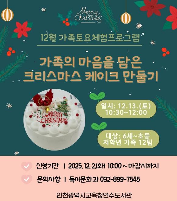이번 프로그램은 6세부터 초등 저학년 자녀와 부모가 함께 크리스마스 케이크를 만드는 체험 강좌로, 크림 데코레이션과 토핑 꾸미기 등 기초 베이킹 활동을 진행한다.