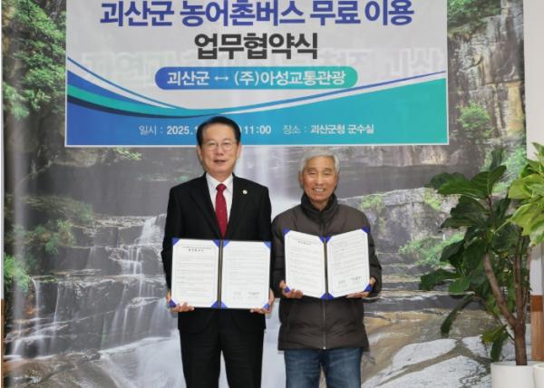[한국제일신문, 김성옥기자] 충북 괴산군은 지난 28일 (주)아성교통관광과 ‘괴산군 농어촌버스 무료 이용 지원을 위한 업무협약(MOU)’을 체결했다고 밝혔다.