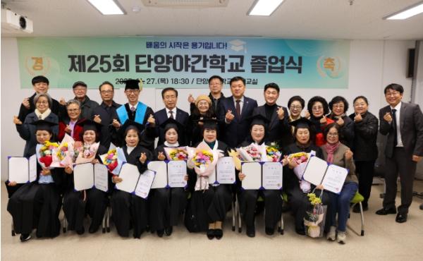 [한국제일신문, 김성옥기자] 배움의 시기를 잃어버린 지역주민들에게 만학의 꿈을 지켜온 단양야간학교(교장 이상곤)가 단양야간학교 통합교실에서 지난 11월 27일에 값진 스물다섯 번째 졸업식을 개최했다고 밝혔다.