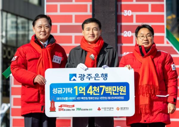 [한국제일신문, 윤진성기자] 광주은행은 1일 아시아문화전당 광장에서 열린 ‘희망 2026 나눔캠페인’ 성금 전달식 및 사랑의 온도탑 제막식에 참석해 총 1억4천7백만 원의 성금을 기탁했다고 밝혔다.