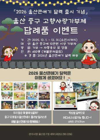 중구는 12월 1일부터 12월 31일까지 중구에 고향사랑기부금을 10만 원 이상 기부하는 선착순 450명에게 기존 답례품에 더해 2026년도 울산큰애기 탁상용 달력을 제공한다.
