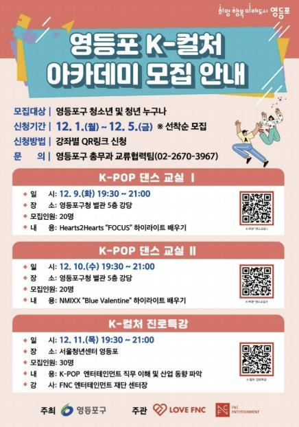 [한국제일신문, 김성옥기자] 영등포구가 글로벌 K-컬처에 관심 있는 청소년과 청년을 대상으로 ‘댄스교실’과 ‘진로특강’으로 구성된 ‘영등포 K-컬처 아카데미’를 운영하고, 참가자를 모집한다고 밝혔다.