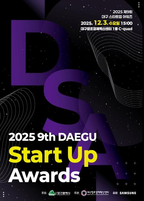 [한국제일신문, 김성옥기자] 대구광역시는 12월 3일 오후 3시, 대구창조경제혁신센터 C-quad(1층)에서 ‘제9회 대구스타트업어워즈’를 개최하고, 지역 창업생태계를 빛낸 우수 스타트업 10개사와 창업지원 유공자 2명을 시상한다.