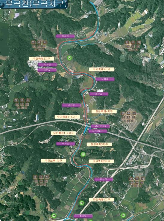 우곡천은 장수면 갈산리에서 화기리까지 이어지는 지방하천으로, 순수 하천 구간은 4.7km이며, 제방·교량 등 공사 구조물 설치 및 보강 구간은 총 6.23km에 달한다.