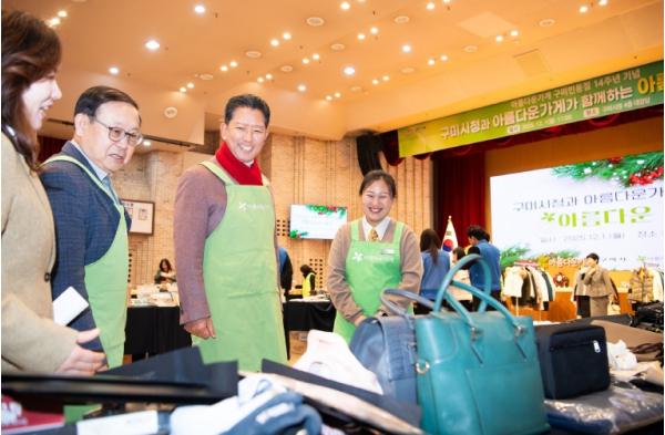 특히 김장호 구미시장, 박교상 구미시의회 의장, (재)장윤경 아름다운가게 상임이사, 신재학 대구경북본부 공동대표, 곽병주 구미시공무원노조위원장이 일일 명예판매원으로 참여해 나눔의 의미를 더욱 키웠다.