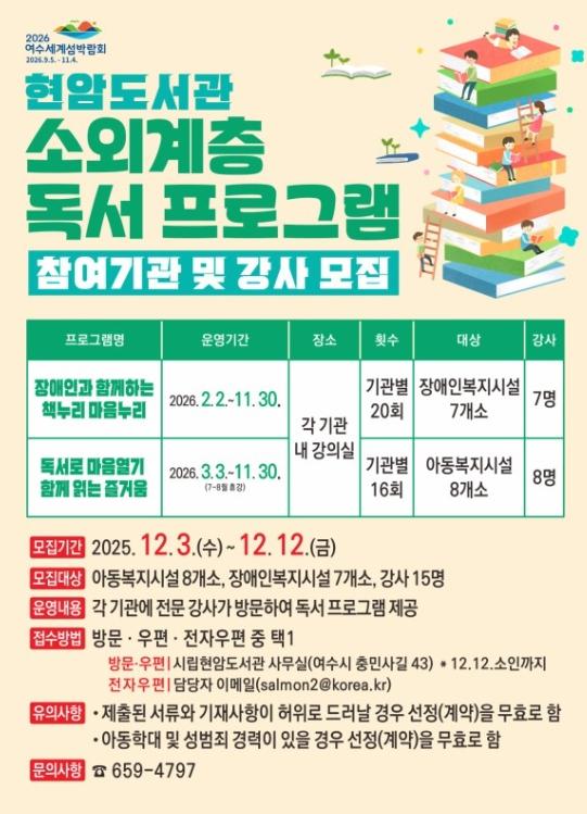 [한국제일신문, 윤진성기자] 여수시립현암도서관은 오는 12월 3일부터 12일까지 소외계층 독서 프로그램 참여 기관을 공개 모집한다.