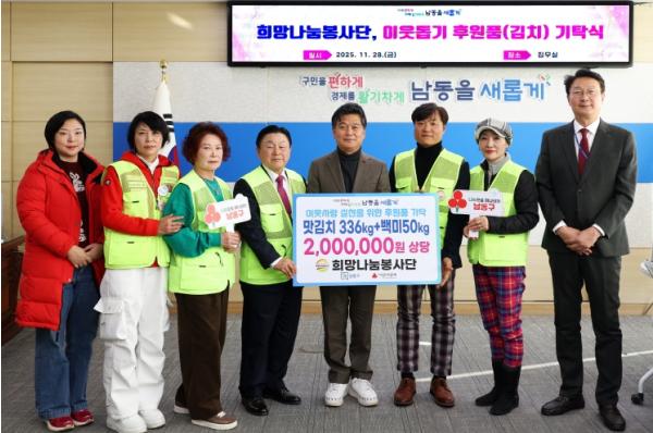 [한국제일신문, 김성옥기자] 인천시 남동구는 최근 희망나눔봉사단(단장 김우현)으로부터 취약계층을 위한 맛김치 336kg과 백미 50kg을 기탁받았다고 2일 밝혔다.