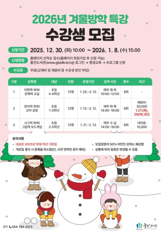 [한국제일신문, 김성옥기자] 경상북도교육청 울진도서관은 내년 1월 13일부터 2월 13일까지 ‘겨울방학특강’을 운영한다.