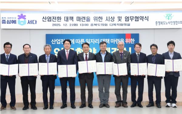 충청북도노사민정협의회(위원장 김영환)는 2일 충청북도의회 다목적회의실에서 산업전환 업무협약 및 시상식·토론회를 개최하고, 산업구조 변화에 따른 고용불안에 선제적 대응을 위한 노·사·민·정 상생협력 체계를 강화했다.