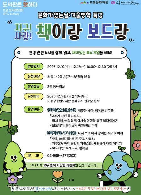 [한국제일신문, 김성옥기자] 서울 도봉구 도봉아이나라도서관이 겨울방학 특별 프로그램으로 ‘책이랑 보드랑’을 운영한다.