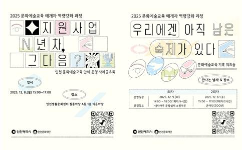 [한국제일신문, 김성옥기자] 인천광역시와 (재)인천문화재단은 인천 지역에서 활동하는 문화예술교육 매개자의 전문성 향상과 지속가능한 활동 기반을 위해 '2025 문화예술교육 매개자 역량강화 과정'을 오는 12월 8일부터 17일까지 운영한다.