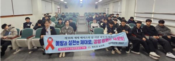 [한국제일신문, 김성옥기자] 청도군은 제38회 세계 에이즈의 날(12월 1일)을 맞아, 지난 2일 풍각면 소재 경북드론고등학교, 청도읍 소재 청도 고등학교 3학년 재학생 145명을 대상으로 에이즈 예방 교육을 실시했다.