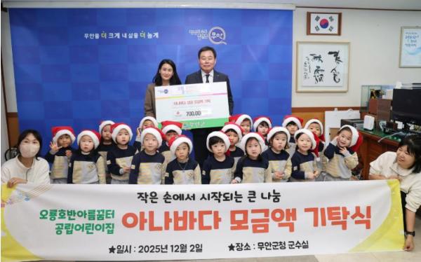 [한국제일신문, 윤진성기자] 전남 무안군은 지난 2일 오룡호반아름꿈터공립어린이집에서 아나바다 모금액 70만원을 기탁했다고 밝혔다.