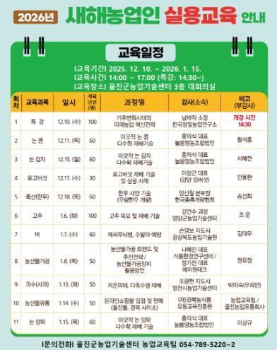 [한국제일신문, 김성옥기자] 울진군은 오는 12월 10일부터 2026년 1월 15일까지 총 11회에 걸쳐 ‘2026년 새해농업인실용교육’을 운영한다.