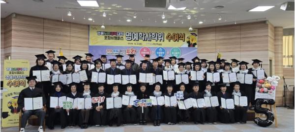[한국제일신문, 김성옥기자] 포항시는 지난 2일 뱃머리평생학습원에서 수료생 54명이 참석한 가운데 ‘2025년 경북도민행복대학 포항시캠퍼스 명예학사학위 수여식’을 열었다.