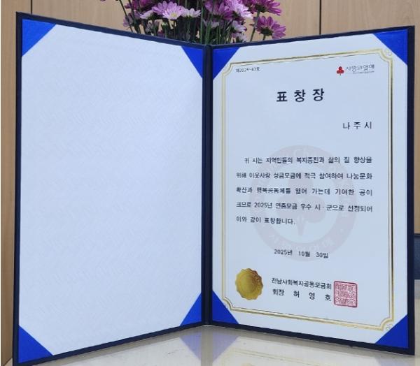 나주시는 ‘희망2025나눔캠페인’을 포함한 연중 모금 실적에서 높은 평가를 받아 2025년 연중 모금 우수 시로 선정됐다고 3일 밝혔다.