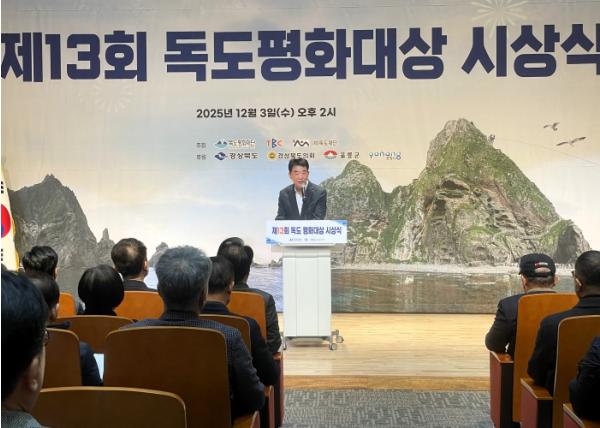 [한국제일신문, 김성옥기자] 경상북도와 (재)독도평화재단은 3일 동부청사 강당에서 경상북도 환동해지역본부장, (재)독도평화재단 이병석 대표, 포항시장, TBC 대표이사, 수상자 등 100여 명이 참석한 가운데 제13회 독도평화대상 시상식을 개최했다.