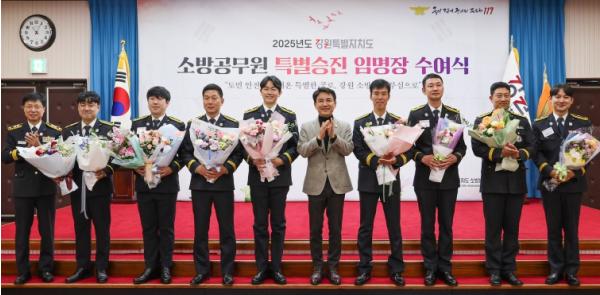 [한국제일신문, 김성옥기자] 강원특별자치도는 12월 3일 도청 신관 대회의실에서 도민의 생명과 안전을 지키는 데 헌신한 우수 소방공무원 8명에 대해 특별승진 임용장 수여식을 개최했다고 밝혔다.