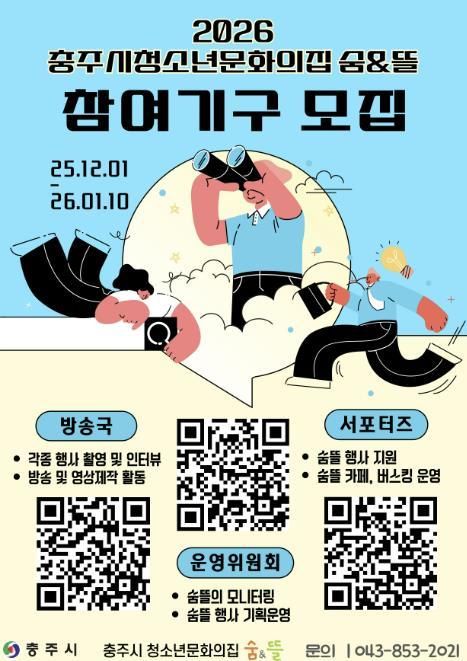 [한국제일신문, 김성옥기자] 충주시청소년문화의집 숨&뜰은 2026년을 함께할 청소년 참여기구 신규부원을 모집한다고 4일 밝혔다.