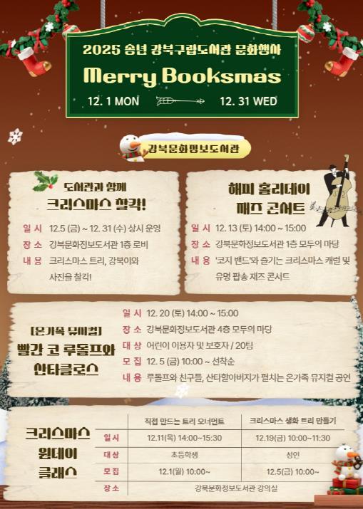 [한국제일신문, 김성옥기자] 서울 강북구는 강북구립도서관이 송년의 달과 크리스마스 시즌을 맞아 ‘2025년 강북구립도서관 송년의 달 기념 행사 Merry Booksmas(메리 북스마스)’를 운영한다고 밝혔다.