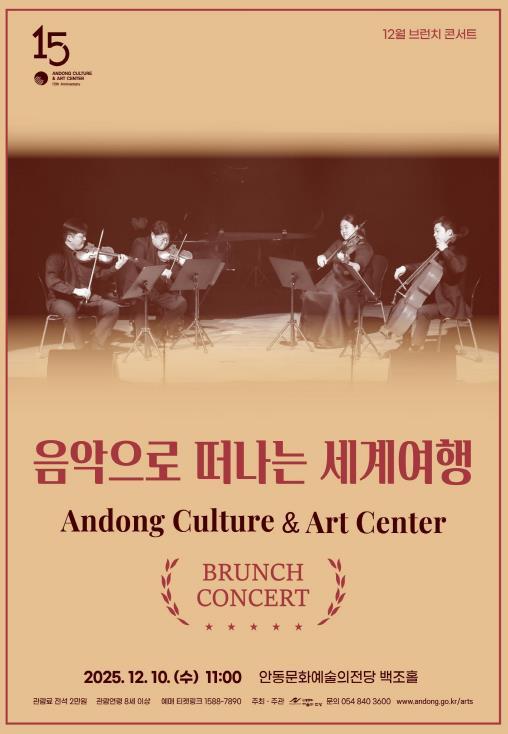 [한국제일신문, 김성옥기자] 안동문화예술의전당은 매월 둘째 주 수요일, 바쁜 일상 속 잠시 여유를 찾고자 하는 클래식 애호가들을 위한 브런치 콘서트를 정기적으로 운영하고 있다. 12월 10일 오전 11시에는 백조홀에서 한 해의 끝자락을 따뜻하게 채워줄 브런치 콘서트 ‘음악으로 떠나는 세계여행’을 선보인다.