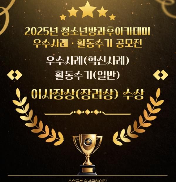[한국제일신문, 김성옥기자] 대구 수성구청소년문화의집 청소년방과후아카데미가 지난 28일 한국청소년활동진흥원이 주관한 ‘2025년 청소년방과후아카데미 우수사례(혁신사례)·활동수기(일반) 공모전’에서 각각 이사장상(장려상)을 수상했다고 밝혔다.