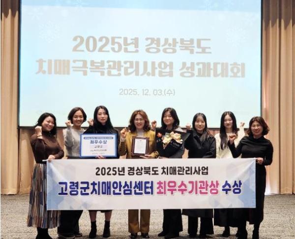 [한국제일신문, 김성옥기자] 고령군치매안심센터는 12월3일 경주 황룡원에서 개최된 2025년 경상북도 치매관리사업 성과대회에서 '최우수기관'으로 선정되어 경상북도지사 표창을 수상하는 영예를 안았다고 밝혔다.