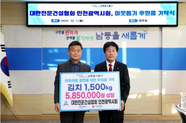 [한국제일신문, 김성옥기자] 인천시 남동구는 대한전문건설협회 인천광역시회(회장 조흥수)에서 취약계층을 위한 김장 김치 1,500kg을 기탁했다고 4일 밝혔다.