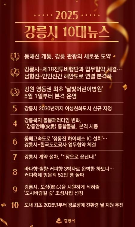 강릉시 관계자는 “올 한 해 강릉의 변화를 이끈 10대 뉴스는 공직자와 시민이 함께 만들어 낸 성과”라며, “이번 결과를 토대로 행정의 사각지대를 더욱 세심하게 살피고, 시민 누구나 일상에서 변화를 체감할 수 있도록 ‘더 큰 강릉, 더 따뜻한 강릉’을 향한 정책을 한층 속도감 있게 추진하겠다.”고 말했다.