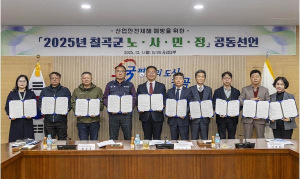 [한국제일신문, 김성옥기자] 칠곡군은 12월 1일 군청 공감마루에서 2025년 칠곡군 노사민정협의회를 개최하고, 산업안전재해 예방을 위한 노사민정 공동선언문에 서명했다.